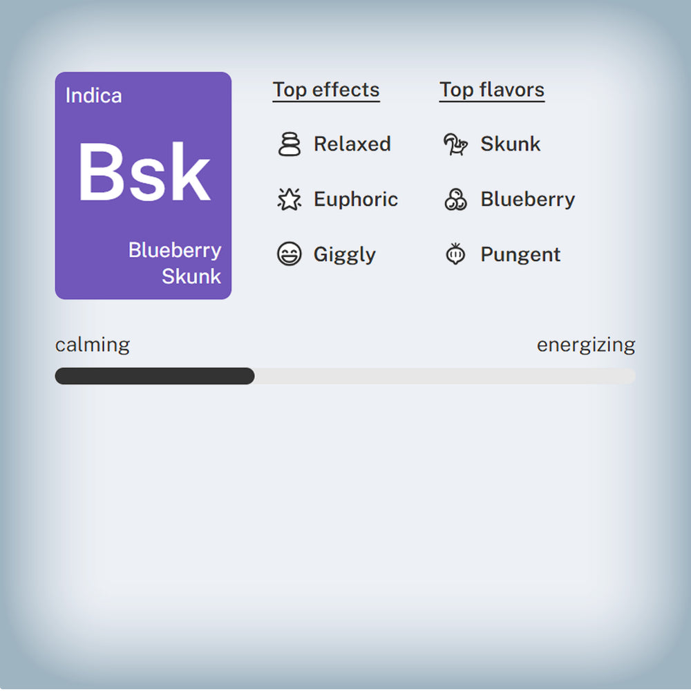 Strain Profile: Blueberry Skunk is an indica-dominant hybrid, renowned for its relaxing effects and a fruity, skunky aroma that soothes the senses. It stems from a cross between the flavorful Blueberry and the pungent Skunk #1.