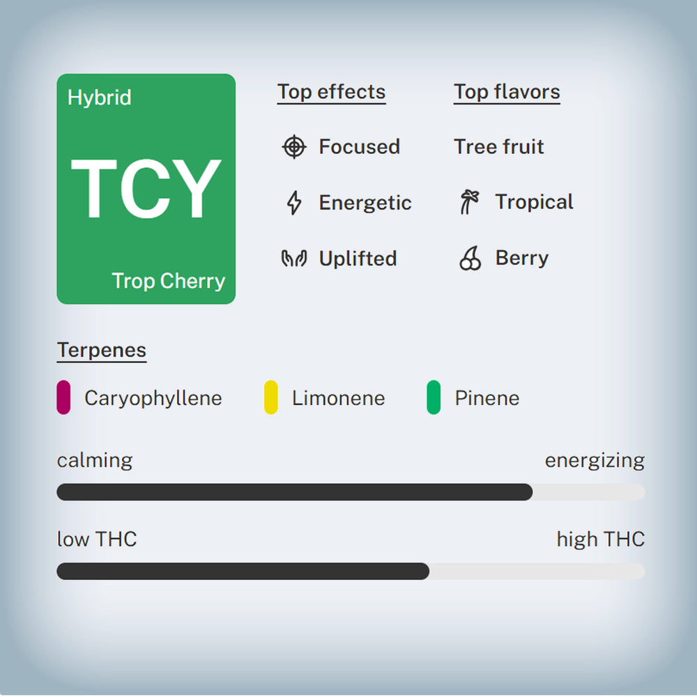 A cross between Tropicana Cookies and Cherry Pie, Tropicana Cherry is known for its zesty orange flavor, tart cherry undertones, and a cerebral, uplifting effect that keeps you focused, happy, and inspired.